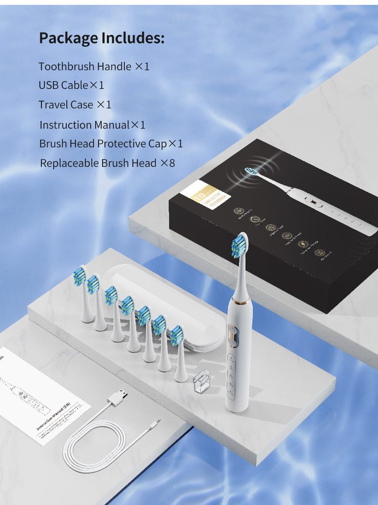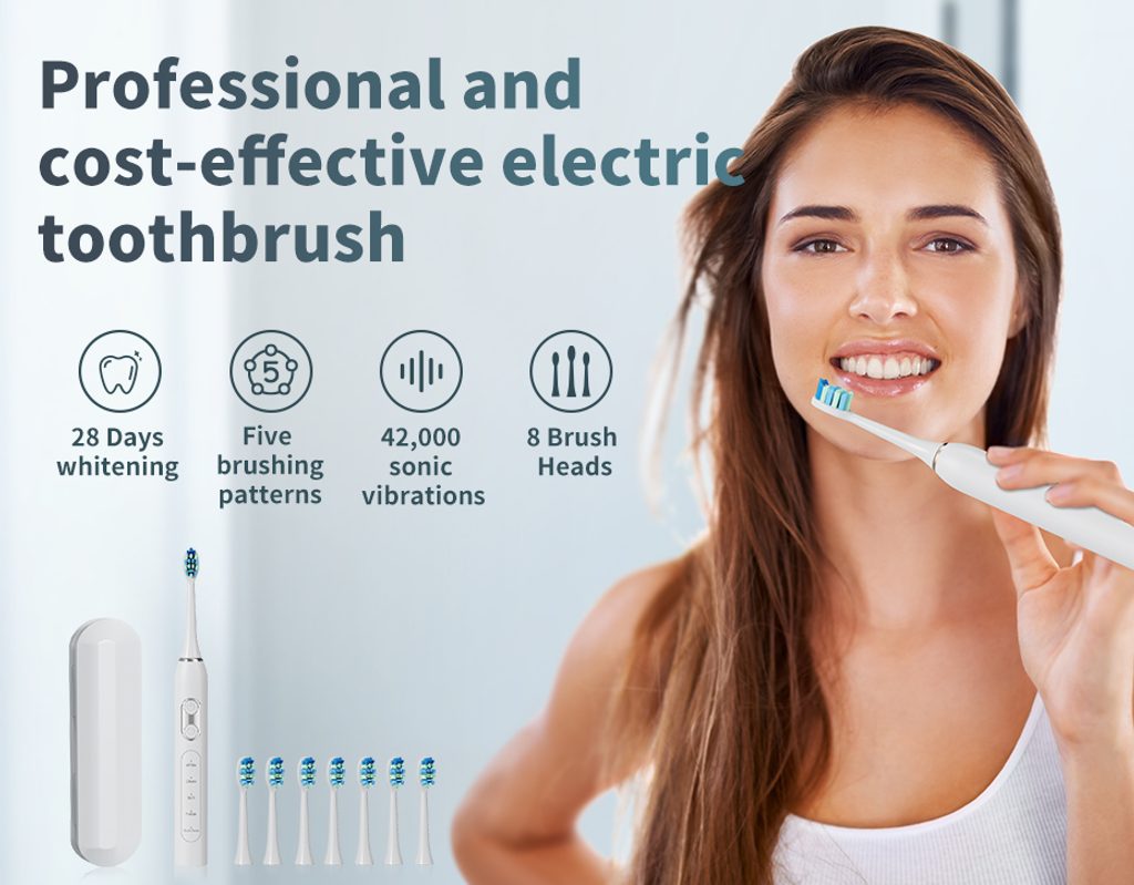 Soniczny elektryczny szczoteczka do zębów z zestawem 8 główek, 42 000 wibracji/min, 5 trybów, czarna