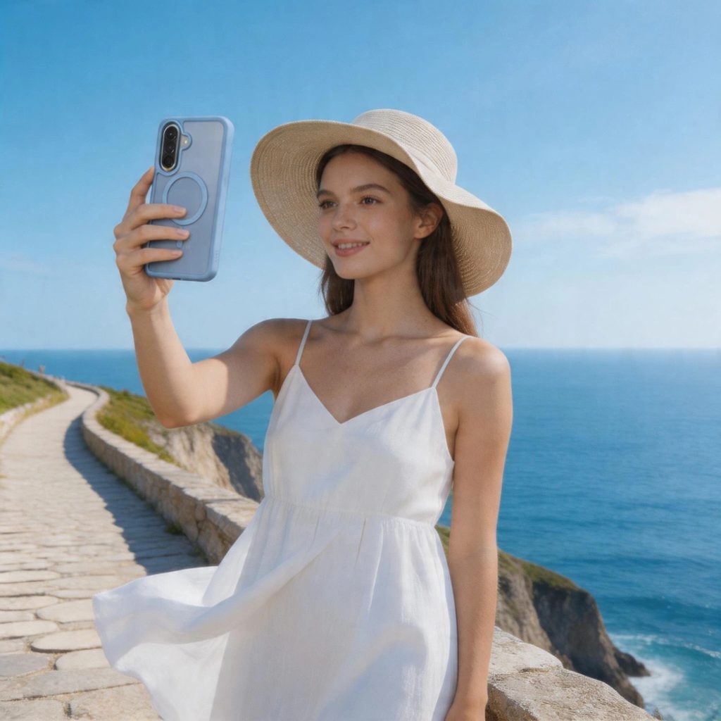 Lekko uniesiony kształt etui wokół aparatu i ekranu chroni telefon przed uszkodzeniem, unosząc go tuż nad płaską powierzchnię.